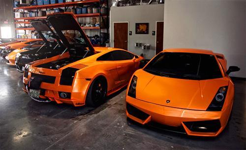 Orange lambos in a workshop