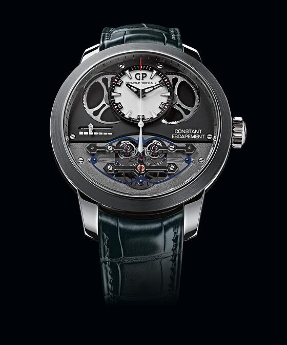 Girard-Perregaux Constant Escapement. The watch has a white-gold case, 48 mm in diameter, and a design in which the balance wheel and escapement occupy most of the lower half of the dial, underneath three small bridges with the brand’s distinctive arrow-shaped ends.