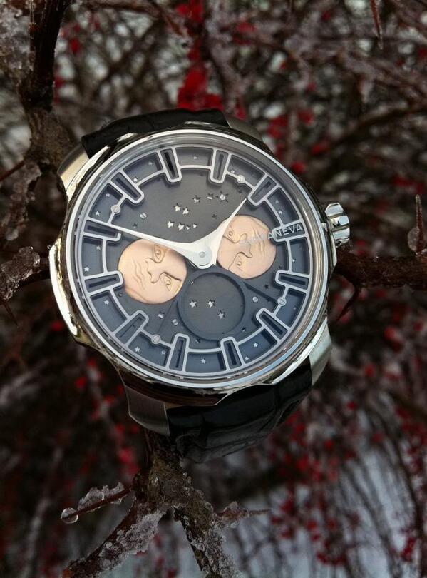 The Sarpaneva Moonshine is either in stainless steel, 18-carat red or white gold (also available with a DLC black case). With a diameter of 42 mm and 10.2 mm thick this watch wears very comfortably. In the aperture below the big moon, the hour disk and moon phase disk are visible. The movement’s mainplate is modified to incorporate phases of the moon function. The stainless steel moon phase wheel with luminous section that represents the moon’s position rotates every 29.5 days. Price – USD 31,000.